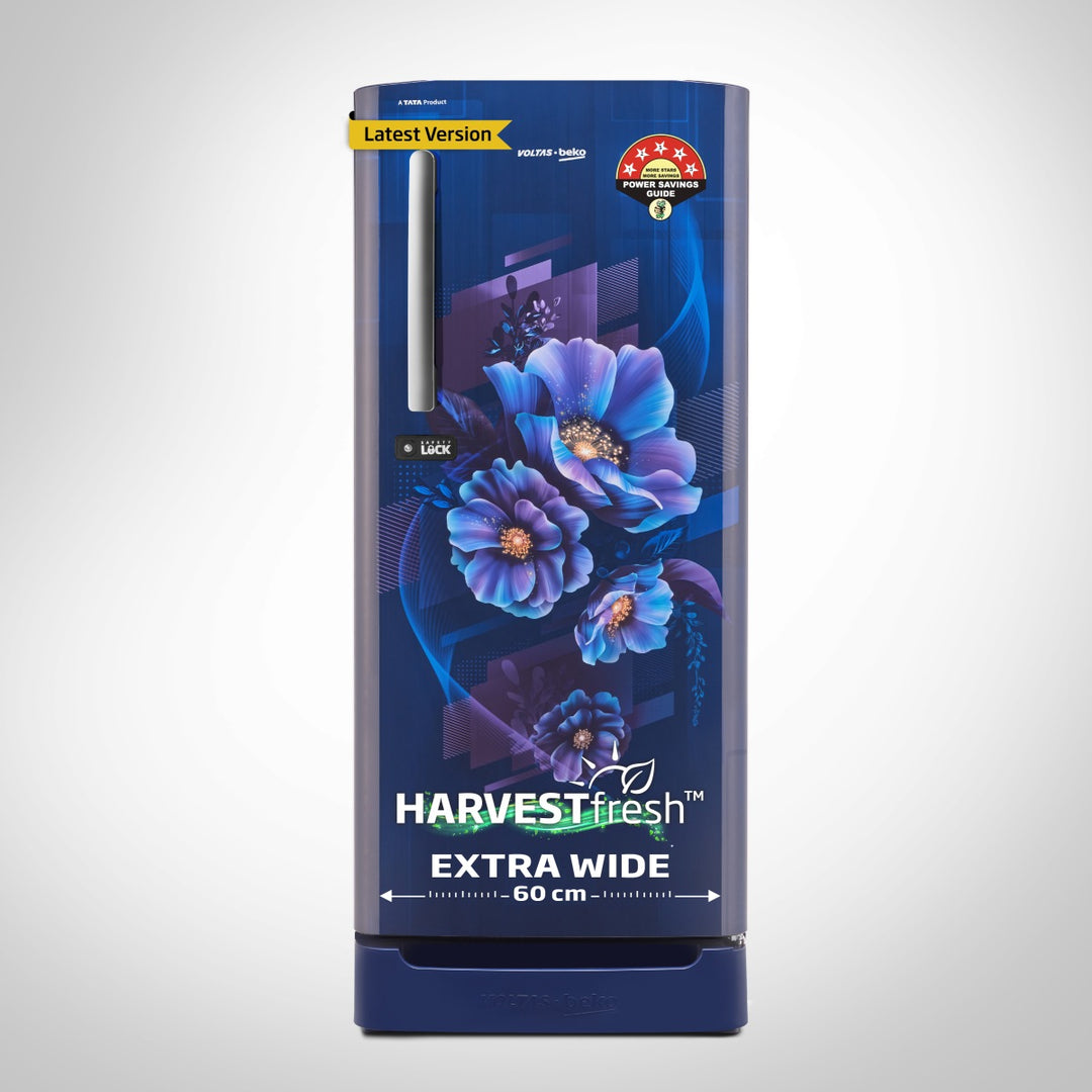 The Voltas Beko Single Door Refrigerator offers efficient cooling and energy savings with Harvest Fresh Technology, preserving Vitamins A & C. Its sleek design, spacious interior, and convenient features make it ideal for any home.
